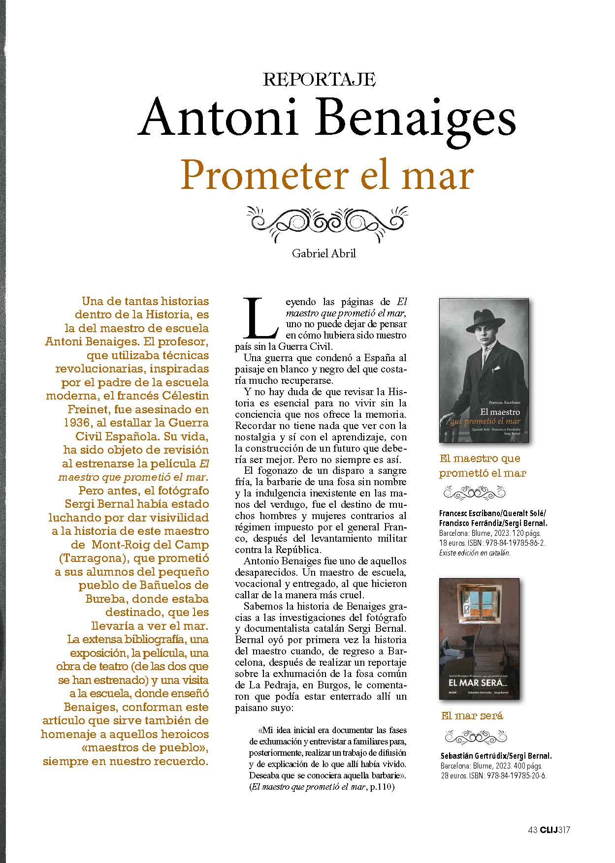 Una de tantas historias dentro de la Historia, es la del maestro de escuela Antoni Benaiges. El profesor, que utilizaba técnicas revolucionarias, inspiradas por el padre de la escuela moderna, el francés Célestin Freinet, fue asesinado en 1936, al estallar la Guerra Civil Española. Su vida, ha sido objeto de revisión en al estrenarse la película El maestro que prometió el mar.